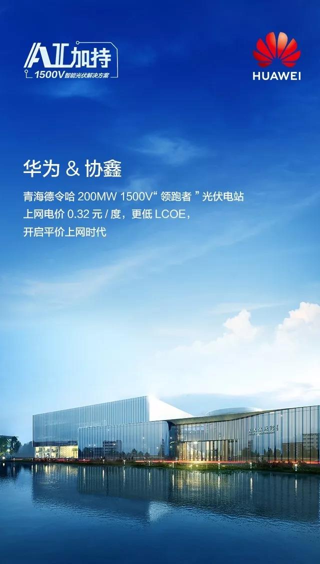 德令哈光伏领跑者项目申报上网电价为0.32元/kWh,低于当地火电价格。200MW全部采用华为1500V智能光伏解决方案,更低LCOE,开启平价上网时代。