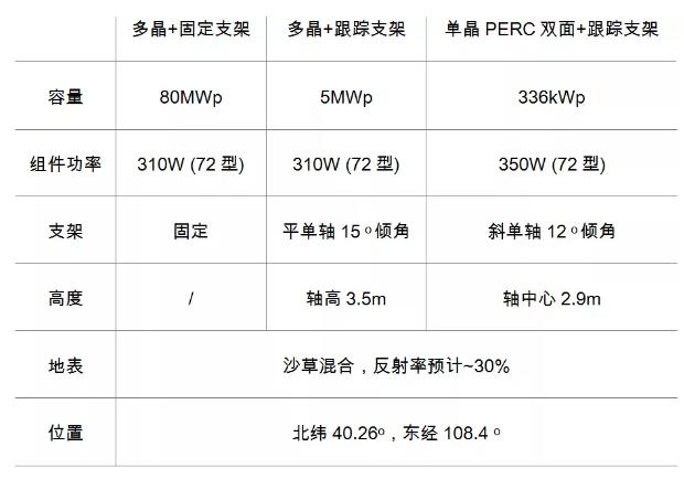 在内蒙古库布奇沙漠中,建有336kWp使用了单晶PERC双面组件的光伏实证电站,该项目建设于2017年5月,是国内最早的使用单晶PERC双面组件建设的光伏项目之一。该项目业主为亿利资源,由隆基乐叶供应960块350Wp单晶双面PERC组件,搭配斜单轴跟踪支架,以验证单晶双面PERC加跟踪系统的发电量增益情况。在双面实证项目旁建设有大规模的搭配固定支架及带倾角的平单轴跟踪支架的常规多晶组件电站作为发电对比参照。