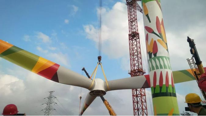 2018年12月26日,金风科技广西崇左天等县牛头岭风电场项目首台机组吊装完成。该项目由系崇左市引进的首个风电场项目。项目规划装机容量50MW。金风科技首次创新性地采用入股分红的方式,帮助当地村民增加集体收入,助力产业扶贫。金风科技以彩绘风机的形式,将铜鼓、壮锦等极具当地自然和民俗风情的图案融入其中,推广当地壮乡文化,打造风电绿色旅游的新型商业模式。不仅如此在项目机位点设计、道路设计、运输、施工、吊装等各项环节,金风科技始终关注绿色要求,强化环保、生态、水保风险控制,发挥专业优势,自觉做好项目建设的生态保护和水土治理,用专业的技术和产品,助力实现人与自然高度和谐,打造绿色标杆风电场。