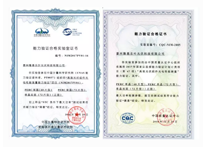 日前,隆基泰州基地组件实验室顺利通过中国计量科学研究院(CNAS 能力验证提供者,PT0037)与中国质量认证中心组织实施的2017年国家认监委能力验证计划C类项目(第47项)“高效光伏组件光电性能测量能力验证”,多款高效单晶PERC组件获得能力验证证书。