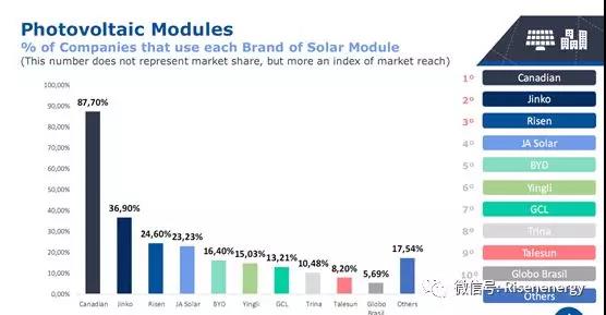报告显示,东方日升在巴西的市场范围指标(an index of market reach)已达24.60%,位列全球第三名。此外报告指出,组件产品质量已成为客户选择品牌的主要参考因素。统计数据显示,一部分巴西供应商已将东方日升视为首选组件供应商,这一占比达到9.79%,位列巴西市场第三名。