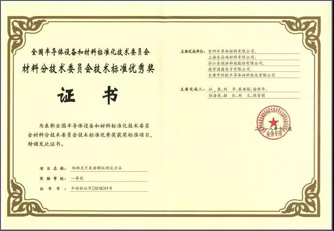 2018年度全国半导体材料标准工作年会在福州隆重召开,会议表彰了半导体材料标准化工作特殊贡献奖、2018年度技术标准优秀奖和半导体材料标准化先进工作者。由中环股份下属公司天津市环欧半导体材料技术有限公司参与编写的国家标准《硅抛光片表面颗粒测试方法》荣获技术标准一等奖。