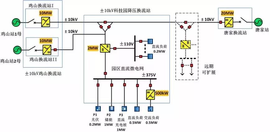 项目由三个直流换流站、一个直流微电网构成,各换流站之间采用地下电缆相连接。工程采用了目前世界最大容量的±10kV电能路由器(直流变压器),成为国际首个±10kV、±375V、±110V多电压等级交直流混合微网示范工程,同时也是世界最大容量的±10kV配网换流站。