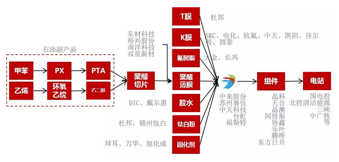 在光伏组件中背板一直是除硅片以外最重要的材料,从大的类型来看可分为复合型、涂覆型、涂复型及共挤型几大类。从结构上来看,背板主要由PET基材、内外层保护材料组成,其中内外层保护材料有T/K膜材、涂层两类。其中,PET的主要原材料为聚酯切片,聚酯切片占据了PET生产总成本的70%,原材料为石油副产品甲苯、乙烯,PET的价格受到国际原油价格的波动影响;T膜、K膜等的主材为氟树脂,氟树脂上游原材料为乙烯、萤石、钛白粉,乙烯受国际原油价格波动影响,萤石国家管控严格,钛白粉应用范围较广,价格也在稳定回升中。胶水主要由树脂、固化剂组成,价格受到石油等大宗商品的波动影响。涂层所用材料为中来自主研发,成本相对更加可控。