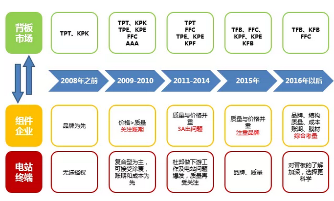 2009~2010年,由于光伏行业快速发展,市场需求旺盛,导致TPT、KPK产品供不应求,也由于成本的下行压力,AAA背板、TPE背板、KPE背板应运而生,FFC双面涂覆背板也随之推向市场。