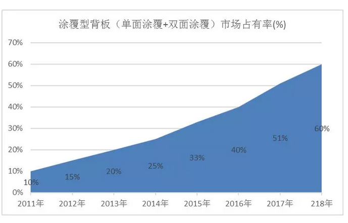 涂覆型背板(单面涂覆+双面涂覆)产品经过10年的发展,已经成长为市场认可的主流背板结构产品,到2017年整体市场占有率超过51%。涂覆型背板在产品质量及性价比方面达到了完美的平衡,是光伏平价上网的必然选择。