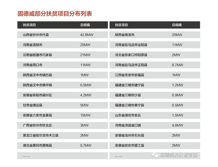 在近年来的光伏扶贫项目中,固德威还相继在安徽的金寨、云南的巧家以及湖北等地的贫困地区参与了众多光伏扶贫项目的建设工作,为数万户建档立卡贫困户脱贫难题提供了帮助。