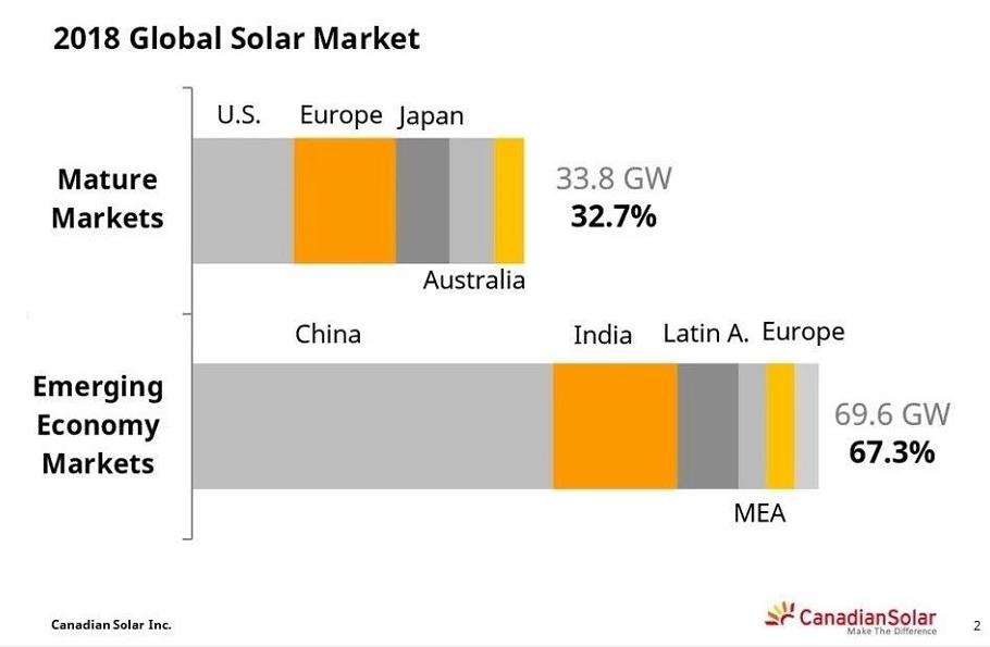 令人意想不到的是,2018年,新兴市场开始引领全球光伏发电的增长,年新增装机预计达到70吉瓦,占全球装机总量的67%。而原先成熟的发达国家市场,年装机量和两年前相差无几,仍旧在34吉瓦左右,全球市场份额占比下降到33%(上图所示)。