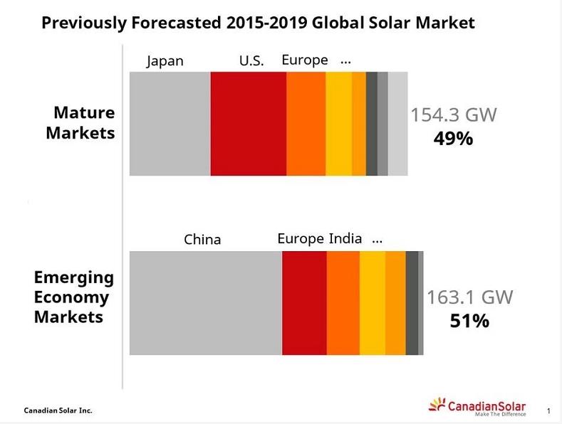 2016年,美国、日本、欧洲等成熟发达国家市场的太阳能年装机量约为34吉瓦,全球市场占比43%,新兴经济体国家年装机容量约为45吉瓦,全球占比57%。