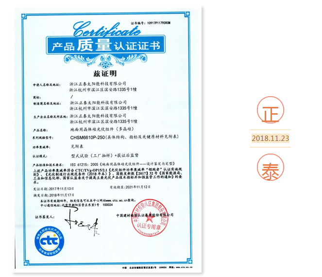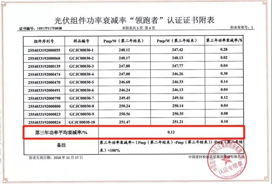 2018年11月23日,由CTC国检集团和TUV莱茵集团主办的“光伏户外实证技术研讨会暨质量提升论坛”在海口顺利召开。浙江正泰太阳能科技有限公司(以下简称正泰太阳能)荣获光伏组件功率衰减率“领跑者”认证。三年来的自然老化测试中,正泰太阳能户外实证成绩连续第三年获此殊荣,且第三年衰减仅0.12%。