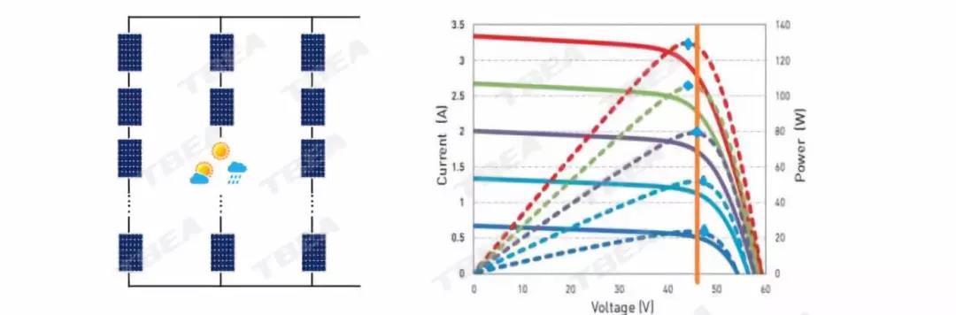 光伏电站现场,难免会因为组串自身(据研究获知即使是标准的组串间,在不受外界干扰时组串间也具有0.3%的差异),布线过程造成组串间电压差异,设计之外(9:00~15:00)的前后排组串遮挡,以及灰尘覆盖、过云、鸟粪、树叶等造成的遮挡,引起组串间并联失配损失,该现象由于双面组件背面背景颜色及反射率的差异并联失配现象尤为显著。