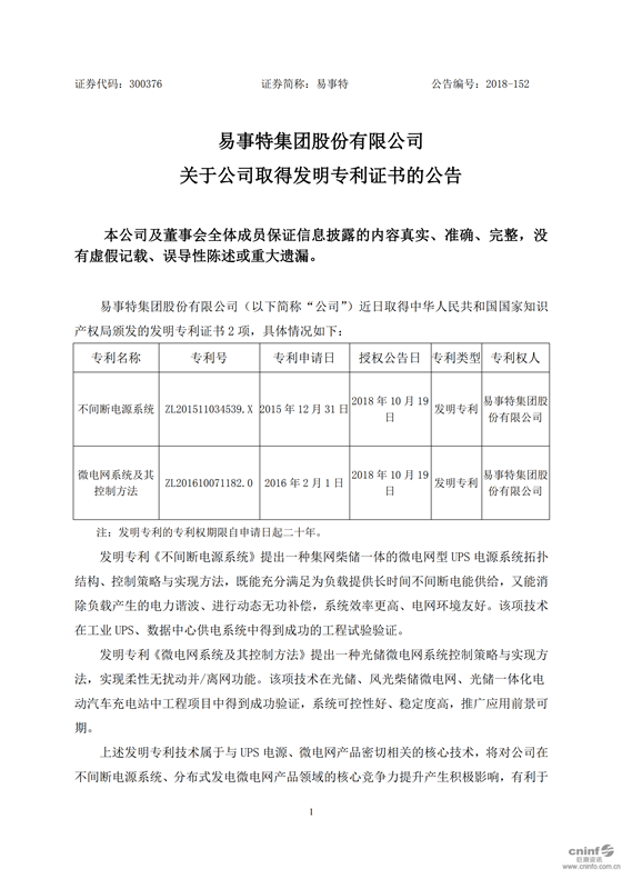 11月20日晚间,易事特发布公告称,公司近日取得中华人民共和国国家知识产权局颁发的《不间断电源系统》和《微电网系统及其控制方法》2项发明专利证书。