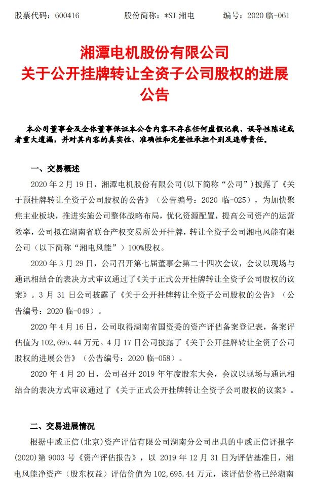 湘电风能100%股权近日正式在湖南联交所挂牌转让,底价是10.27亿元,截止时间为5月25日。2019年湘电风能资产总额为67.82亿元,年营收15.40亿元,净利润-9.38亿元。2020年第一季度,营收2.54亿元,净利润为-4842.13万元。