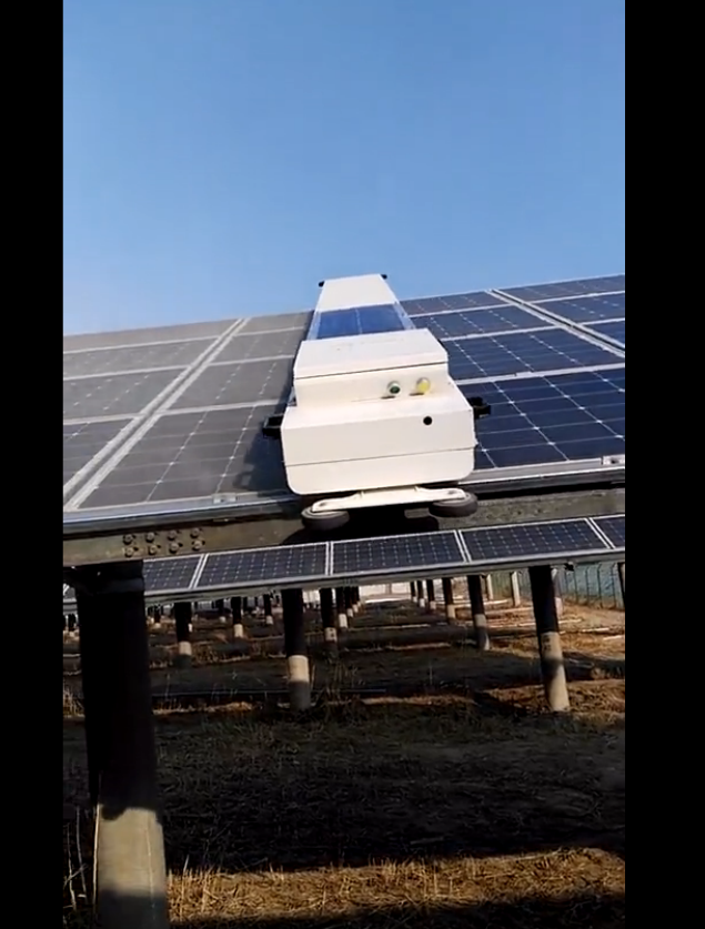 机器人通过自供电系统,配备独立物联网通讯模块、环境监测系统、弹簧导向轮、特殊定制毛刷,实现对光伏电站高频次高效率清扫,并主动提示、推送发电设备故障和告警信息,通过运维机器人自带的无线通讯功能,远程监测所有机器人运行状态和运行数据,实现对机器人的远程控制,从而实现远程故障诊断、极端天气自保护、降水联动清扫等多种智能模式。并通过配备停靠支架,在组串之间安装桥接提高单个设备利用率。