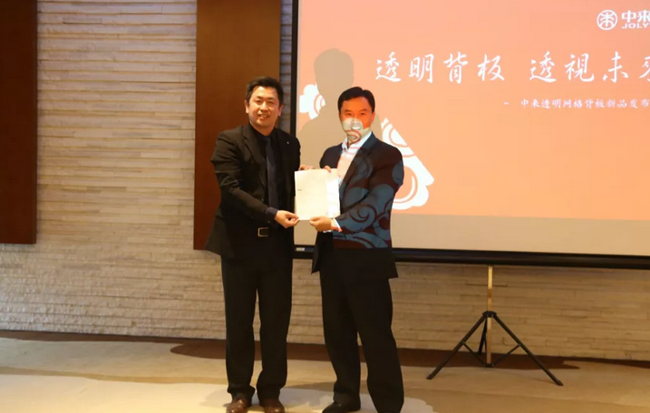 中来透明背板产品也获得了首张第三方机构认证证书,莱茵技术(上海)有限公司总经理柏成立亲手将证书交到中来股份副总裁谢建军手中,这也标志着透明网格背板正式推向市场。