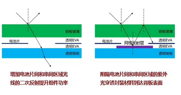 在透明背板的基础上,中来再次开发了透明网格背板,在组件电池片之间空白区域增加反射网格,不仅能增加组件的功率,还能更好的保护背板的内层,一层网格,双重功效。