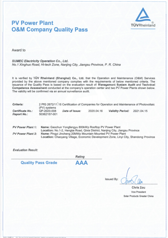 近日, TÜV莱茵完成对苏美达能源旗下江苏苏美达电力运营有限公司运维服务商认证的年审,并向其颁发Quality Pass(运维服务商等级评估服务)AAA证书。AAA是TÜV莱茵全球运维认证体系内对运维能力签发的最高等级证书。