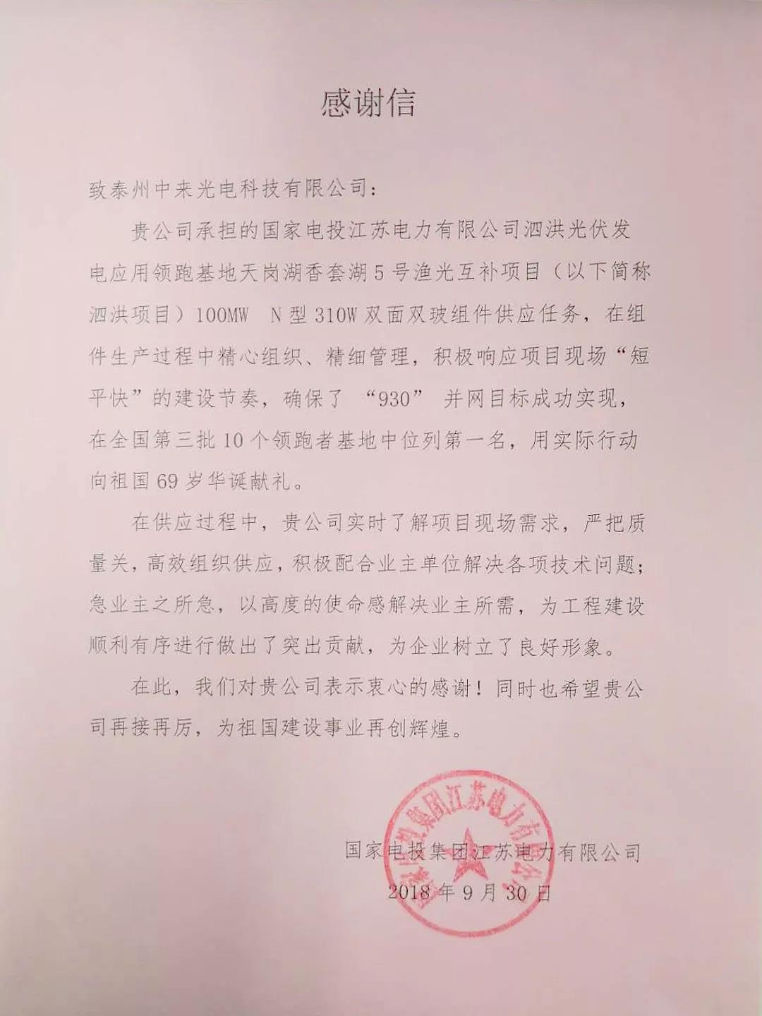 近日,国家电投集团江苏电力有限公司向中来发来了一份情真意切的感谢信。信中表达了对中来股份在承担的泗洪光伏发电应用领跑者基地天岗湖香套湖5号渔光互补项目,积极响应项目 “短平快”节奏,确保了项目在 “930”成功实现并网,并在全国第三批10个领跑者基地中位列第一名的高度认可。