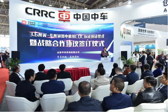 10月17日上午,山东中车风电有限公司亮相2018北京国际风能大会暨展览会,推出CWT2500、CWT4000平台陆上整机产品系列机型。随后权威认证机构CQC向山东中车风电公司3.6-4MW风电机组颁发了认证证书,双方举行战略合作协议签订仪式。