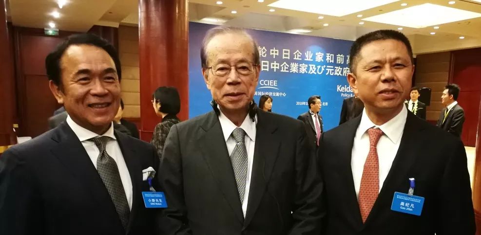 日本前首相福田康夫(中)、三井物产中国总代表小野元生(左)与高纪凡(右)在会场合影