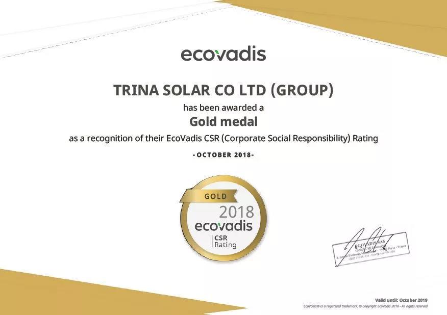 全球知名第三方独立评估机构EcoVadis日前发布2018全球企业社会责任评估结果,天合光能企业社会责任表现稳步提升,位列全球电子元件制造行业板块排名前3%,被授予“企业社会责任成就金奖”,这是天合光能连续第二年获此殊荣。