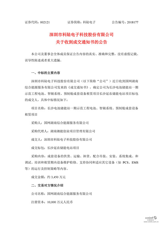 10月8日晚间,科陆电子发布公告称,公司近日收到国网湖南综合能源服务有限公司发来的《成交通知书》,确定公司为长沙电池储能站一期示范工程电池、智辅系统、预制舱成套设备租赁项目长沙延农储能电站项目标包的成交人,成交金额约3,450万元。