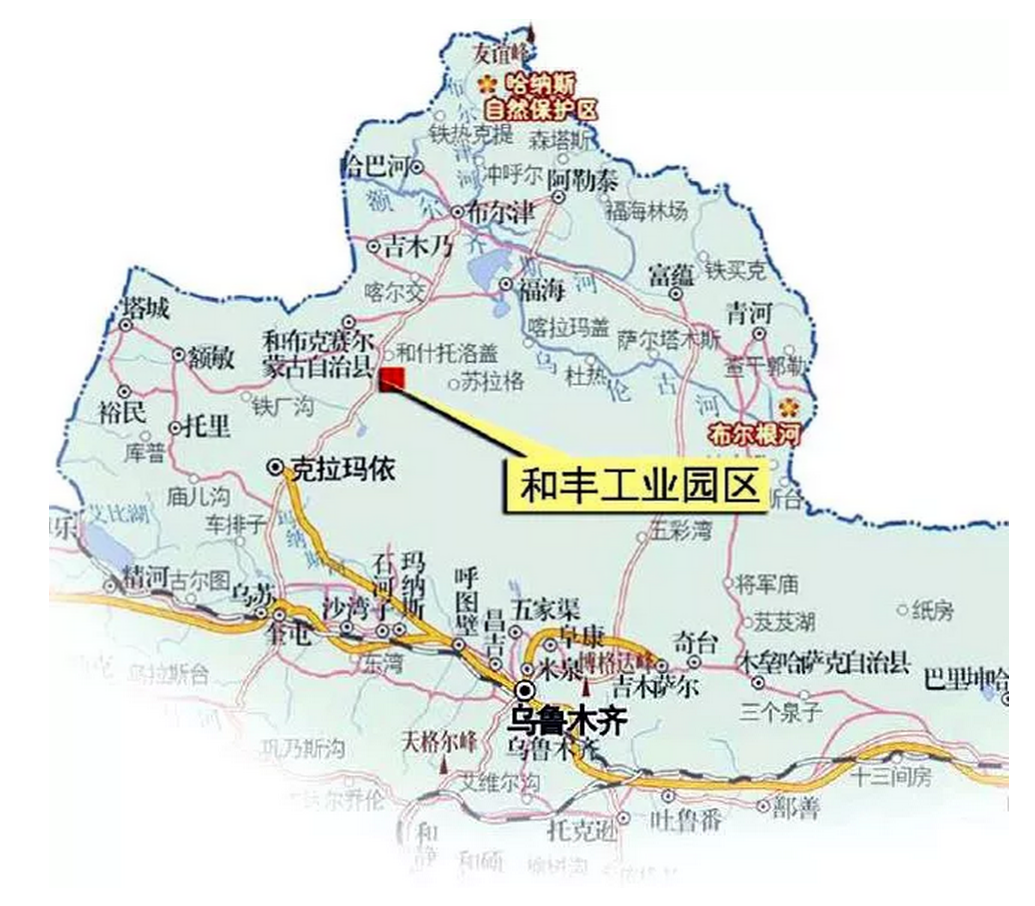 新疆和丰工业园区位于和什托洛盖镇以南约15公里,地处塔城、阿勒泰、克拉玛依三地中心位置,总体规划面积约67平方公里。园区周边矿产资源富集,煤炭储量超千亿吨,预计石油储量20亿吨,天然气300亿立方米,探明盐储量18.4亿吨,探明纳基、钙基膨润土储量23亿吨,氧化铍储量4万吨,均居亚洲第一。此外,铜、金、铁、石灰石、石英砂、高岭土、油砂、油页岩等金属非金属矿产资源也很丰富。园区围绕“煤化工、煤电冶、盐化工、石油化工”四条产业链的产业发展定位,推进优势产业向园区集中,引进项目关联度高的企业,最大限度发挥园区的聚集效应,向国家级工业园区挺进。目前苏新能源和丰公司、庆华集团、湖北宜化等多家企业项目已开工建设和计划落户。力争2020年建成产值过千亿、税收过百亿的工业园,率先在地区实现工业化目标。