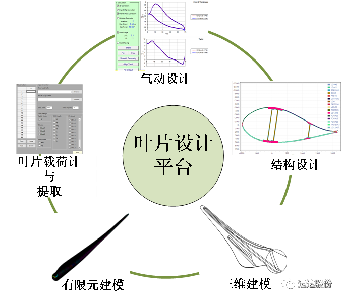 运达股份之所以能够在较短的时间内设计出如此高性价比的叶片,主要归功于运达叶片——整机一体化的设计流程和高度集成的叶片设计平台。