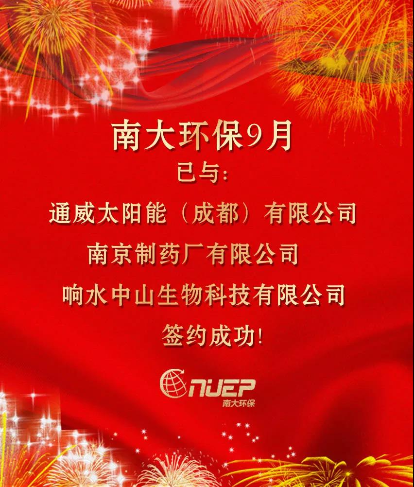 9月份,江苏南大环保科技有限公司分别与通威太阳能(成都)有限公司、南京制药厂有限公司、响水中山生物科技有限公司成功签约。
