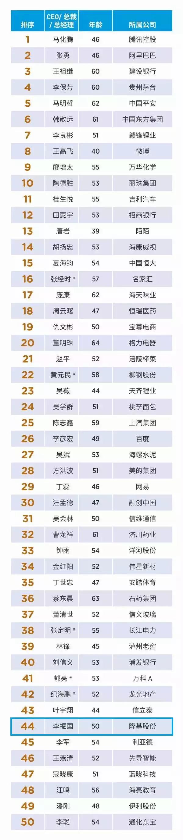 9月25日,福布斯中国推出了“2018中国上市公司最佳CEO”榜单,在50名上榜的CEO中,隆基股份总裁李振国入选,排名第44位。腾讯控股的行政总裁马化腾、阿里巴巴的首席执行官张勇分别位列第一和第二位。