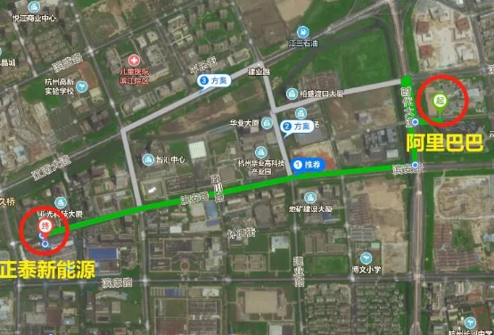 阿里巴巴与正泰新能源同位于杭州,两家公司在杭州滨江的园区,相距不过2.3公里,开车5分钟,打车起步价。