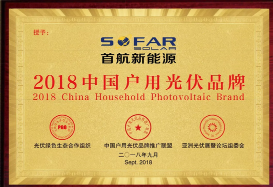 首航新能源再获“2018中国户用光伏品牌”殊荣