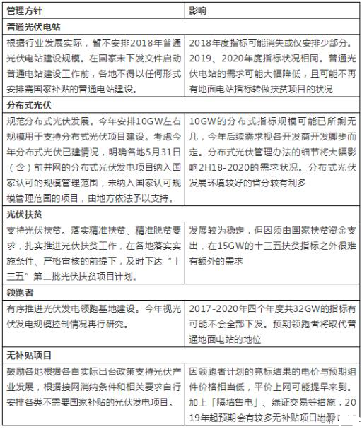 新政对需要补贴的光伏新建项目加强限制,主要包括暂停安排2018年普通光伏电站建设规模,年内分布式项目规模限制在10GW左右等,新政明显地对光伏扶贫和领跑者项目影响较少。由于2018年政策紧缩的程度较大,有不少业内专家预计中国2018年光伏行业需求将下调至30-35GW的范围,2019和2020年,中国市场需求预计都将维持在30-40GW的范围。而这些滑落的需求将严重影响光伏行业的中游组件商及上游原材料商,反而对下游光伏电站运营商及开发商影响最少,特别是技术、规模、效率及管理皆全面领先的行业龙头,更有机会受益于组件与原材料因行业供过于求而出现的价格快速下跌(对光伏电站来说,组件及硅原料的价格被认为是生产成本),有利于后续项目继续维持在合理正常的收益率。