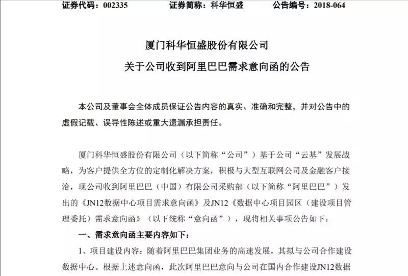 8月15日,科华恒盛发布《关于公司收到阿里巴巴需求意向函的公告》称,“13日,公司收到阿里巴巴采购部的《JN12数据中心项目需求意向函》及JN12《数据中心项目园区(建设项目管理委托)需求意向函》。为满足阿里巴巴的高速业务发展需求,拟与科华恒盛合作建设JN12数据中心。”