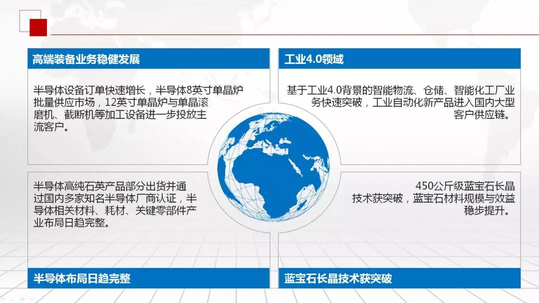 2018年上半年,公司持续注重技术创新,以晶体生长及智能化加工设备为代表的主营产品收入规模持续扩大,报告期内验收设备同比增长;今年以来半导体设备、工业自动化相关业务较快增长,蓝宝石材料也获得稳定发展,为报告期的业绩奠定了较好的基础。