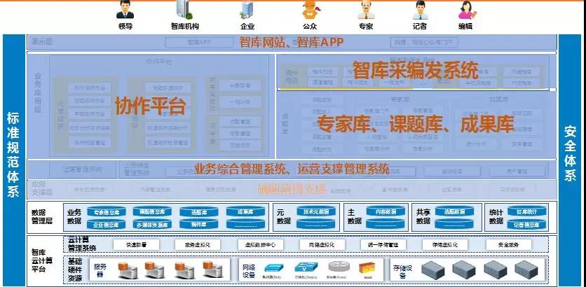 在核心内容“三库一平台”建设的基础上,同时建设 “智库门户网站”、“智库APP”、“智库采编发系统”、“业务综合管理系统”、“运营支撑管理系统”等各类支撑及管理系统。