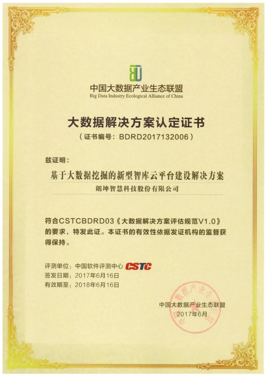 2017年6月,在中国大数据产业生态联盟与中国软件评测中心联合举办的优秀大数据产品及解决方案企业评测活动中,朗坤以《基于大数据挖掘的新型智库云平台建设解决方案》这一经典案例荣获优秀奖项。