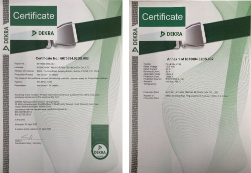 苏州同泰新能源荣获DEKRA德凯全球首张额定电流30A三分体光伏接线盒DEKRA Seal证书