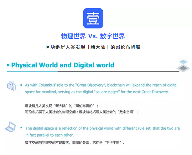 区块链就好像哥伦布的那艘帆船一样,但是它带给我们的不是物理空间的新发现,不再是一个新的美洲,而是数字空间的新发现。