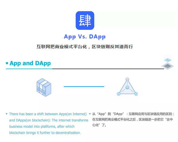 在互联网时代,我们把应用叫做 App。在区块链时代,我们把应用叫 DApp。App 和 DApp,充分地说明了互联网和区块链之间的区别,非常重要的一个区别。