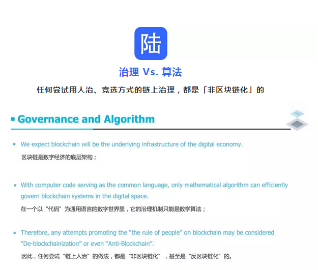 我们很难相信在数字世界里面,让机器和机器、或者人和机器来用英语、用中文进行沟通。所以任何尝试用人治的方法,甚至用竞选的方法,用参议员三权分立的方法来做的区块链治理,都是反区块链的,是非区块链的做法。