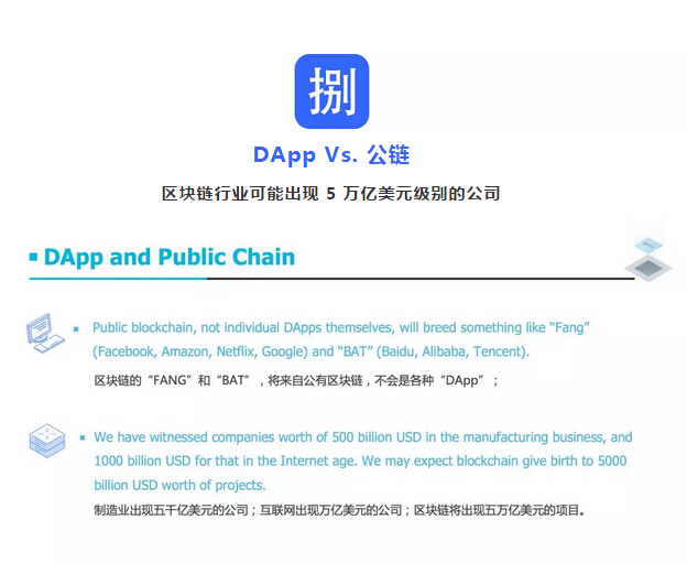 如果有人问哪个区块链会成为将来的阿里巴巴、Facebook 或者谷歌?这种级别的市值,只能是公有区块链,任何 DApp 都不可能成为像 Google、Facebook、亚马逊、阿里巴巴或者腾讯这样的公司。