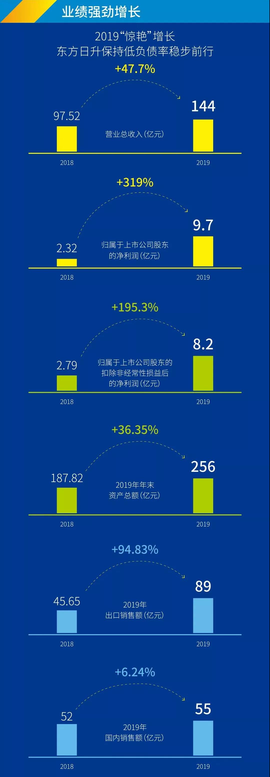 东方日升最新发布的2019年年报显示,公司报告期内实现营业收入144.04亿元,同比增长47.70%;归母净利润9.74亿元,同比增长319.01%。东方日升此前曾就业绩变动表示,当期公司光伏电池片及组件产量增加、相关光伏产品实现的销售收入增加,相应销售利润增加,此外获得的政府补助等非经常性损益对公司净利润的影响金额增加。