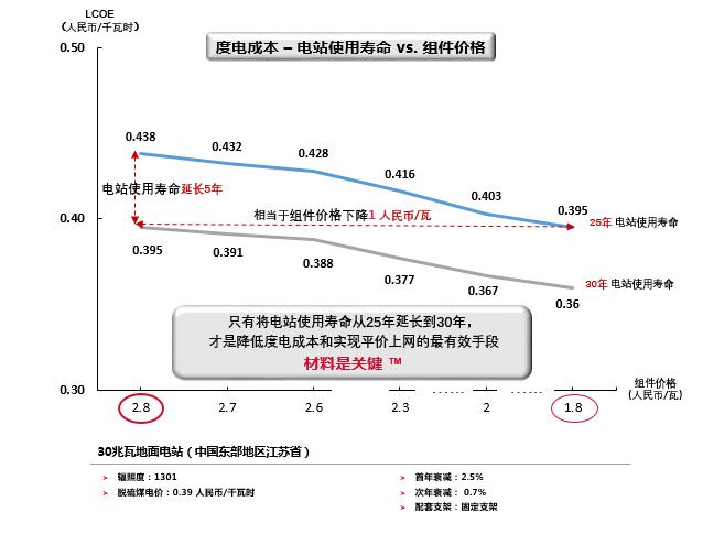 由以上计算结果可知,如果将组件寿命从25年延长到30年,度电成本就能下降0.043元/千瓦时,在2.8元的组件价格下已经基本实现了平价上网!而组件价格下降0.1元/W,电站度电成本仅下降0.006元/千瓦时;为了达到平价上网,组件价格需要大幅下降1元/W。在推动度电成本下降方面,延长电站寿命远比下调组件价格成效大。光伏系统运行越久,电力成本就越低,就可以获得更高的投资回报。如果能将电站使用寿命从25年延长到30年,可以大幅降低度电成本,提前实现平价上网。可以说,30年品质等于加速推动平价上网,平价上网可以最终不依赖补贴而得以实现。